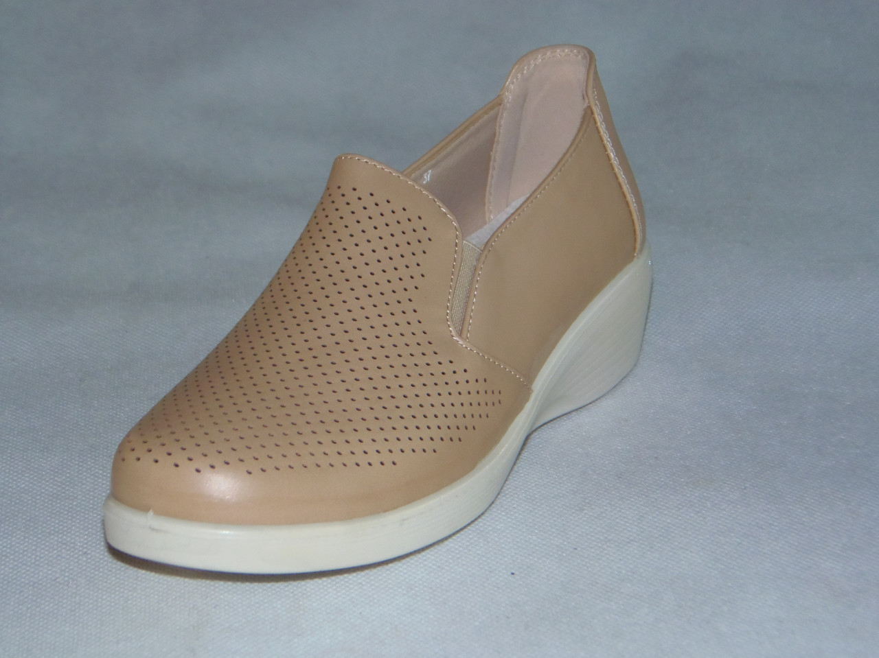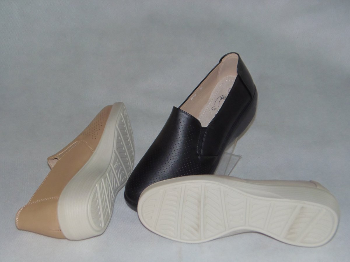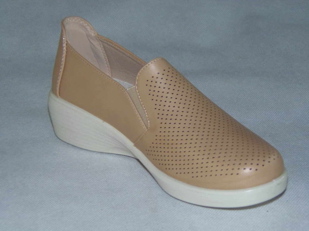 Półbuty damskie wsuwane gumka z boku, podeszwa klin, wierzch bez szwowy z delikatnymi dziurkami.