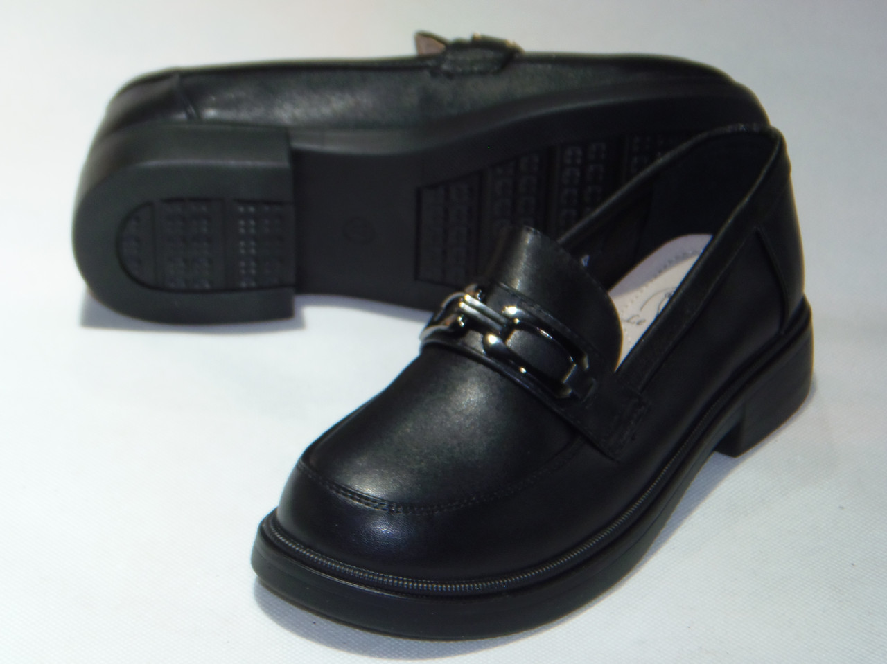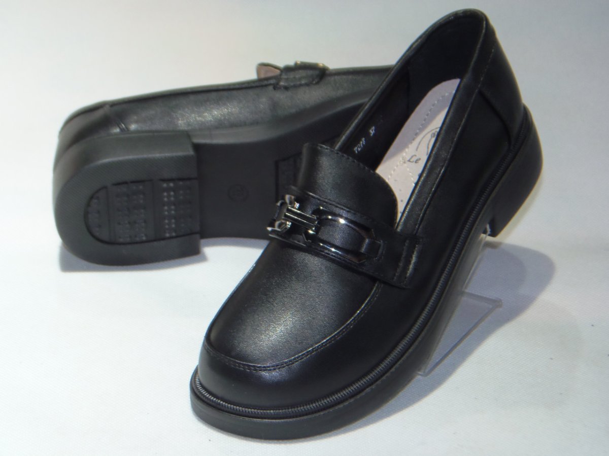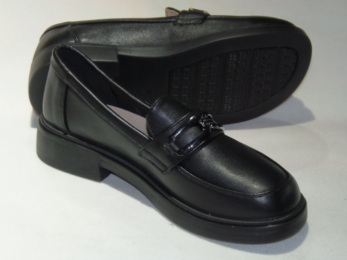 Półbuty damskie wsuwane ozdoba metalowa i obcasik.