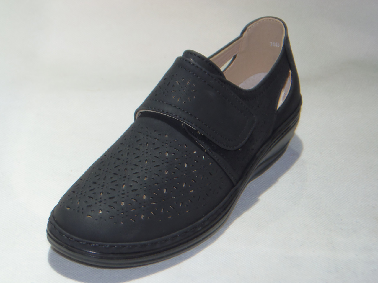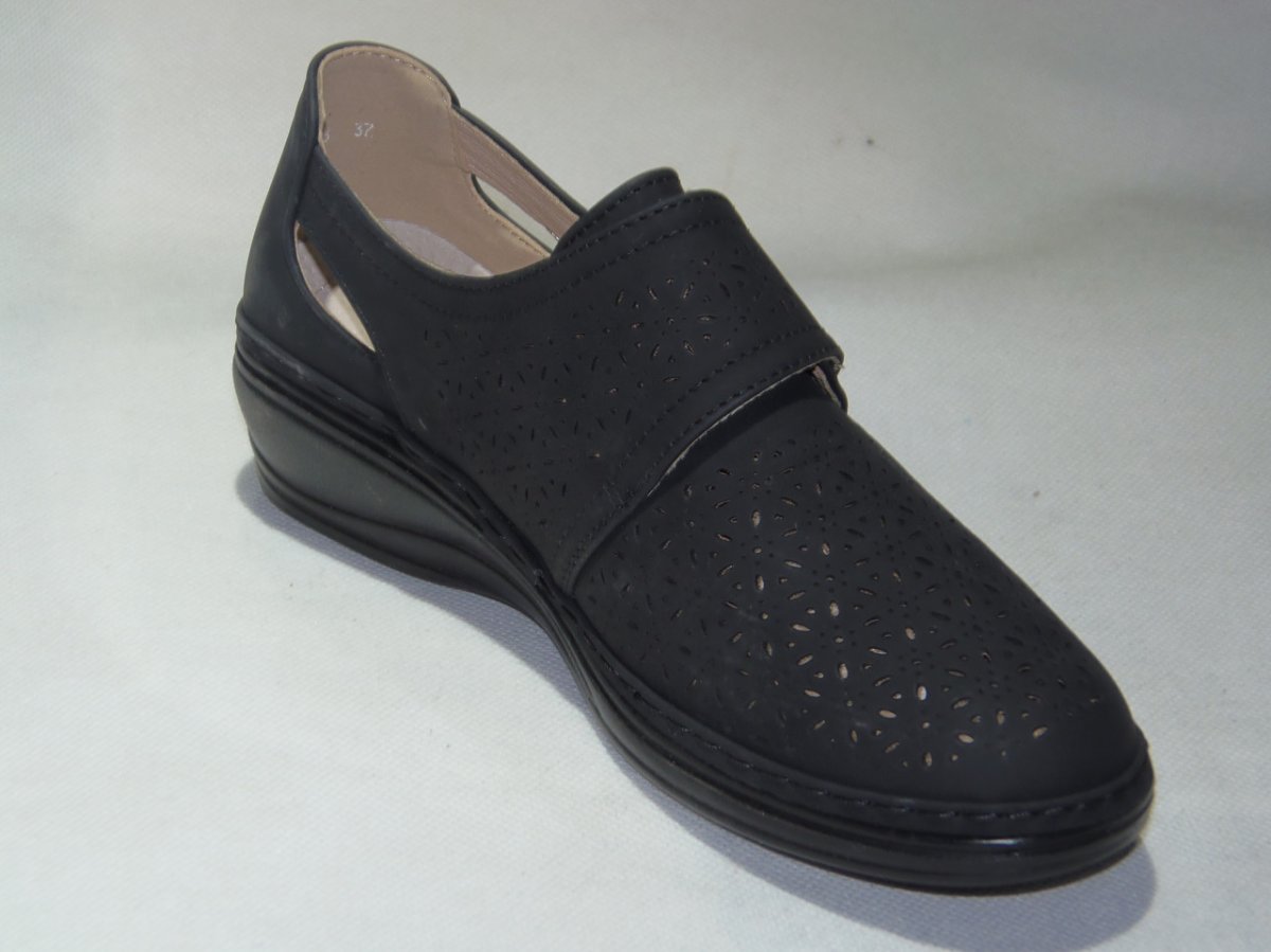 Półbuty damskie wsuwane z rzepem, podeszwa klin, z dziurkami na wierzchu PU.