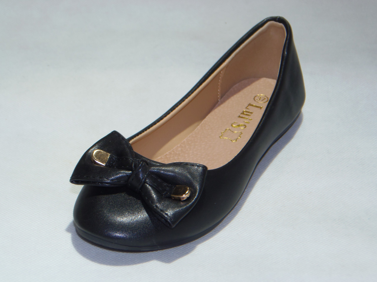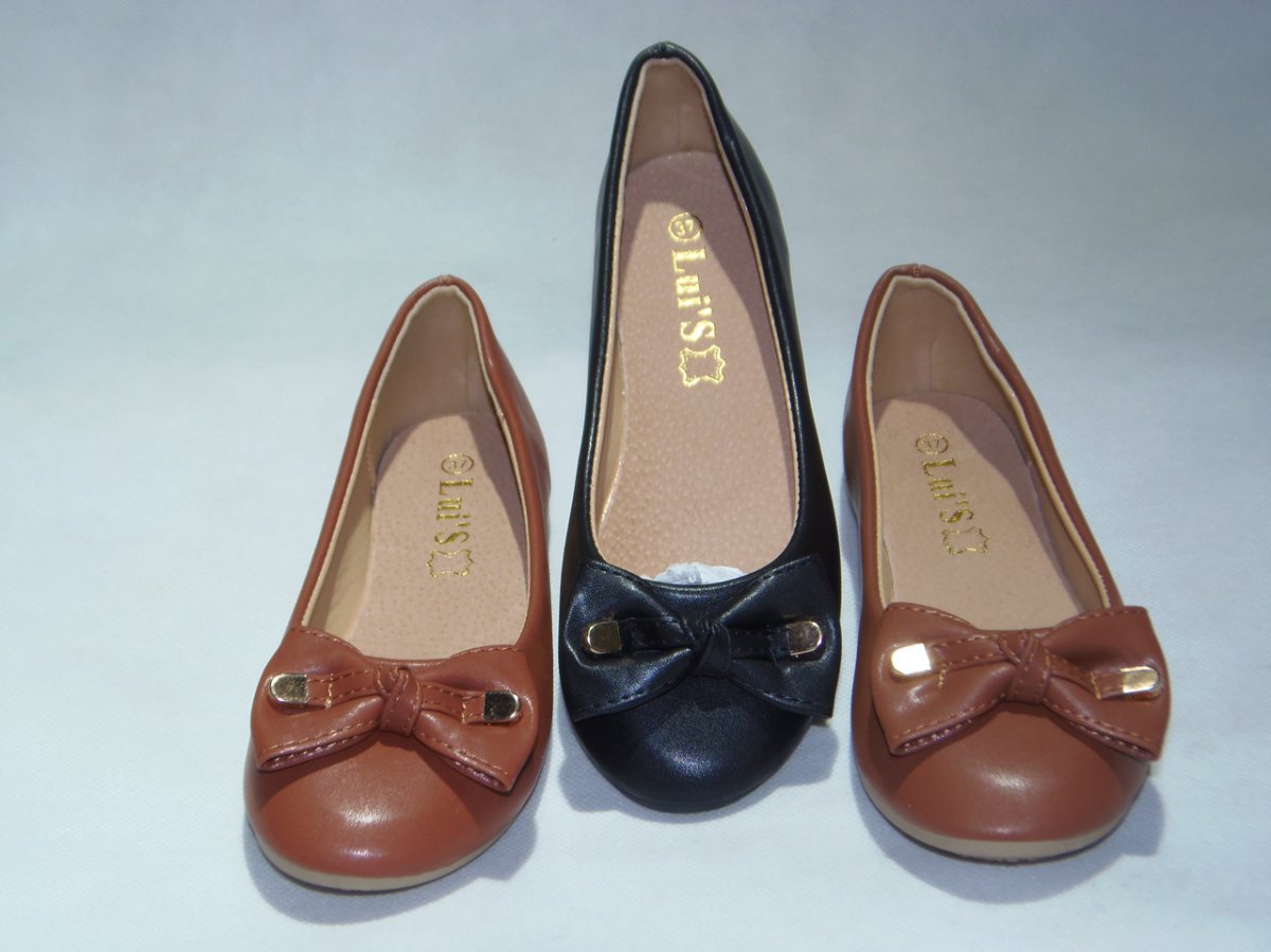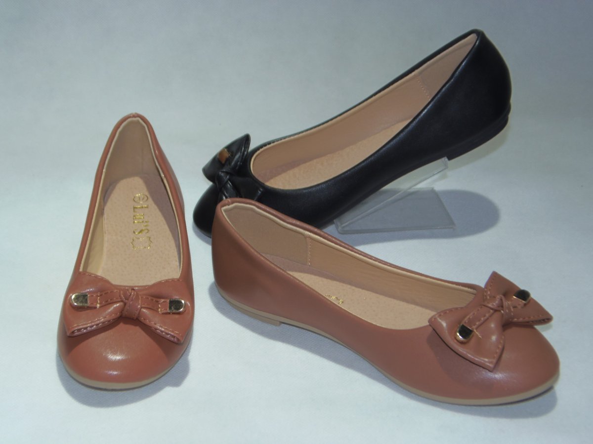 Balerinka PU z ozdobną patką i kokardką z metalowym zakończeniem, podeszwa płaska.