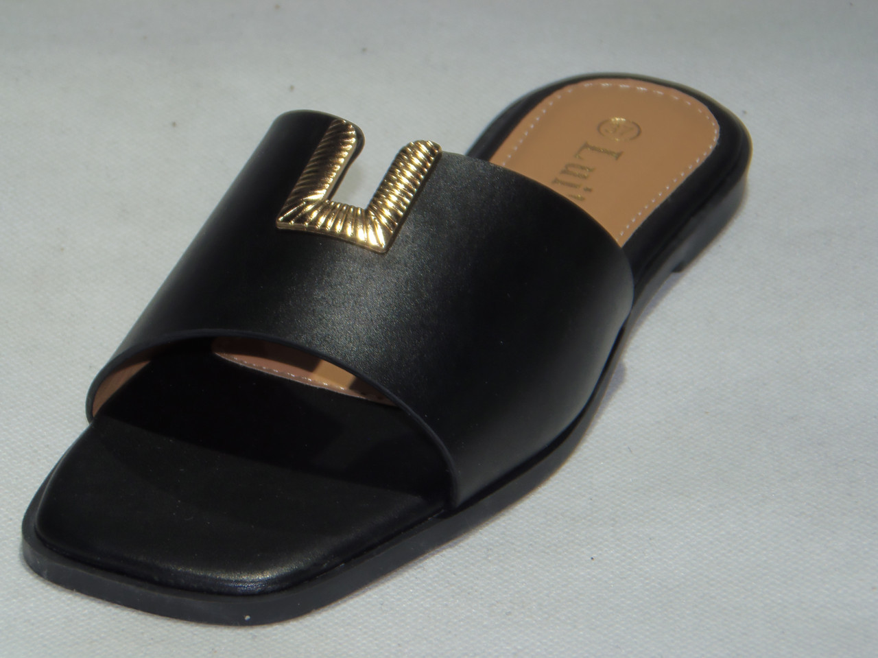 Klapki damskie płaskie z metalową ozdobą.