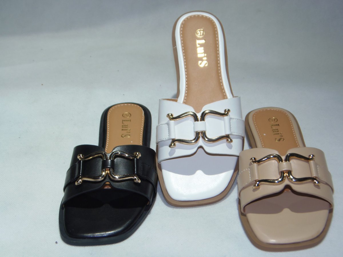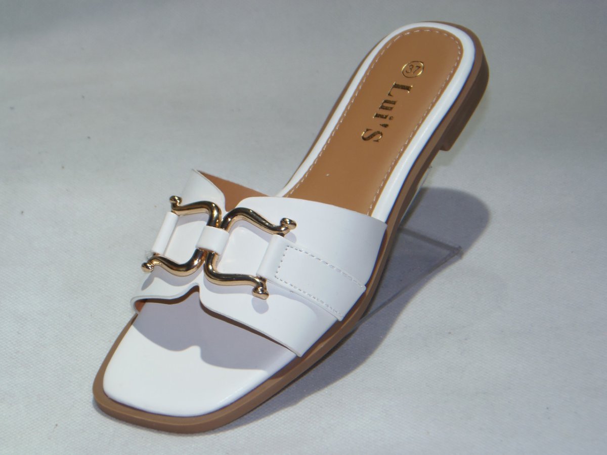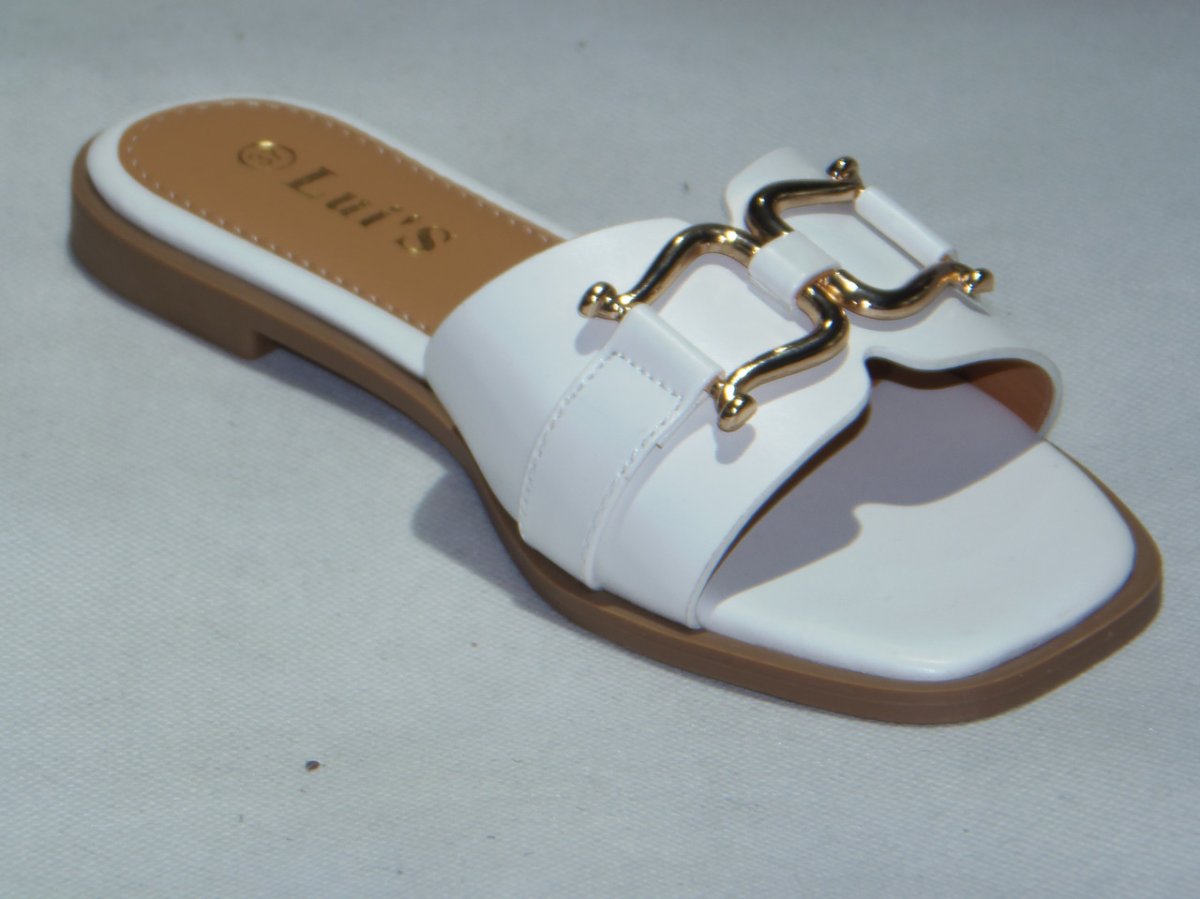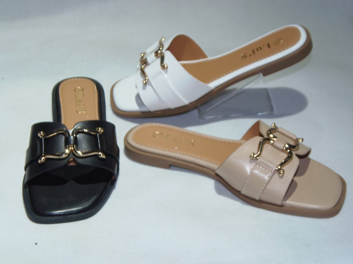 Klapki damskie płaskie z dwoma metalowymi klamrami.
