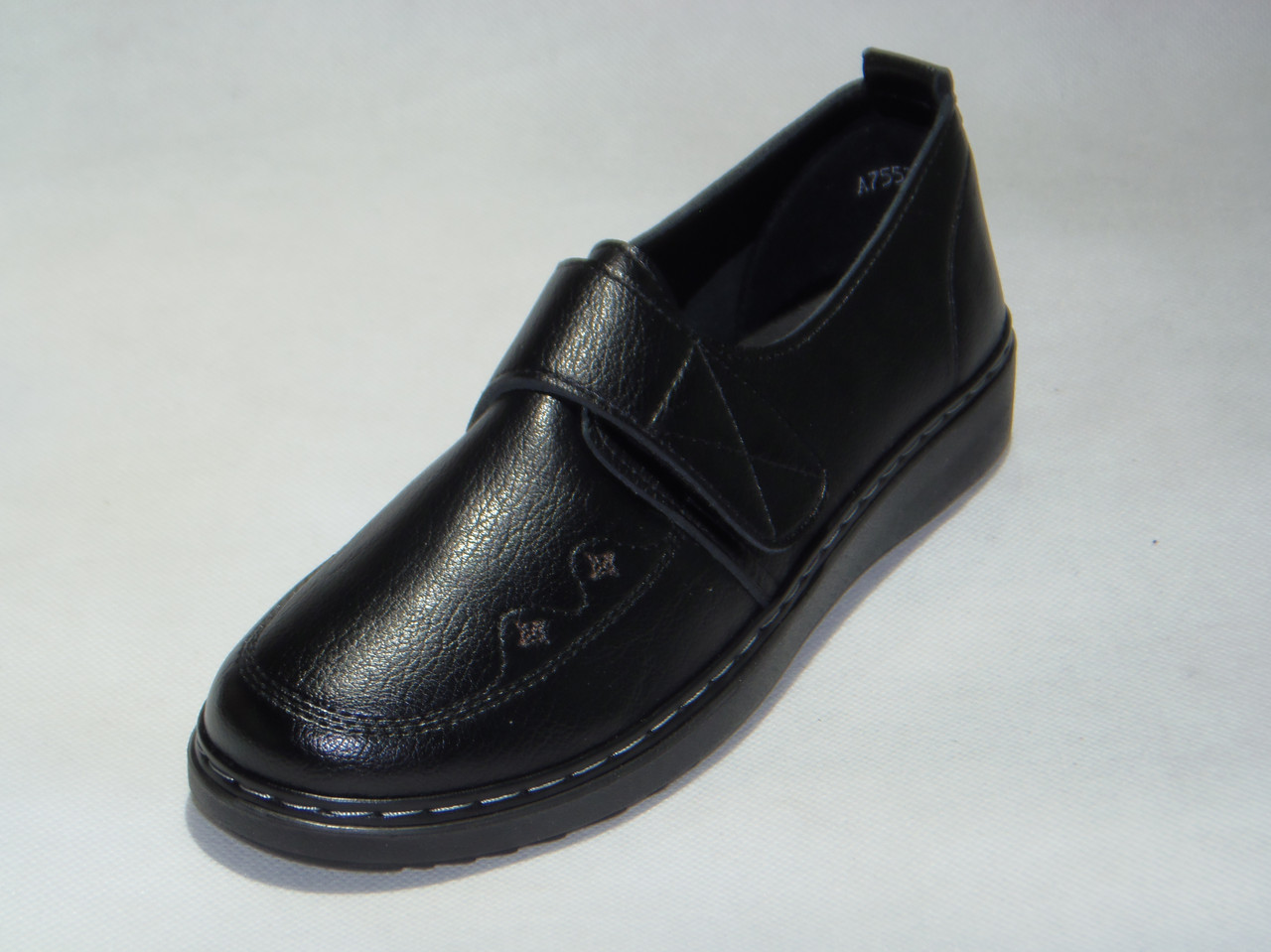 Półbuty damskie wsuwane z rzepem oraz ozdobnym haftem z przodu podeszwa niski klin szyta.