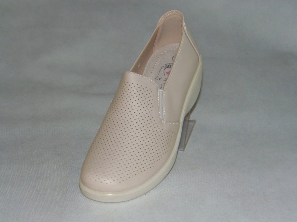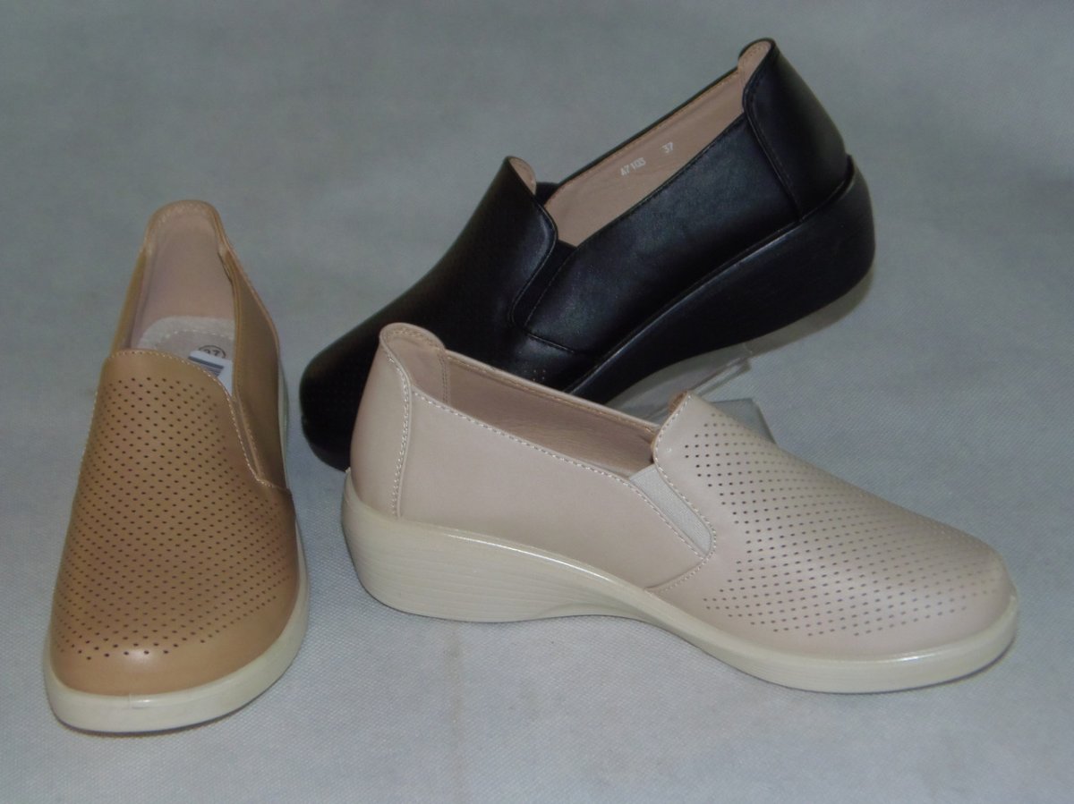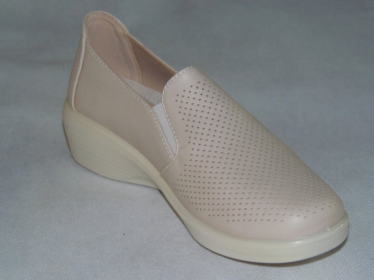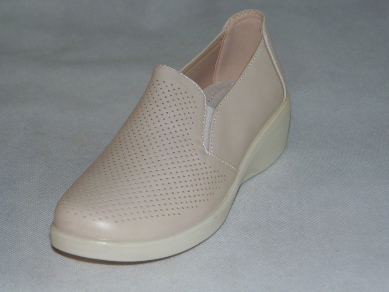 Półbuty damskie wsuwane gumka z boku, podeszwa klin, wierzch bez szwowy z delikatnymi dziurkami.