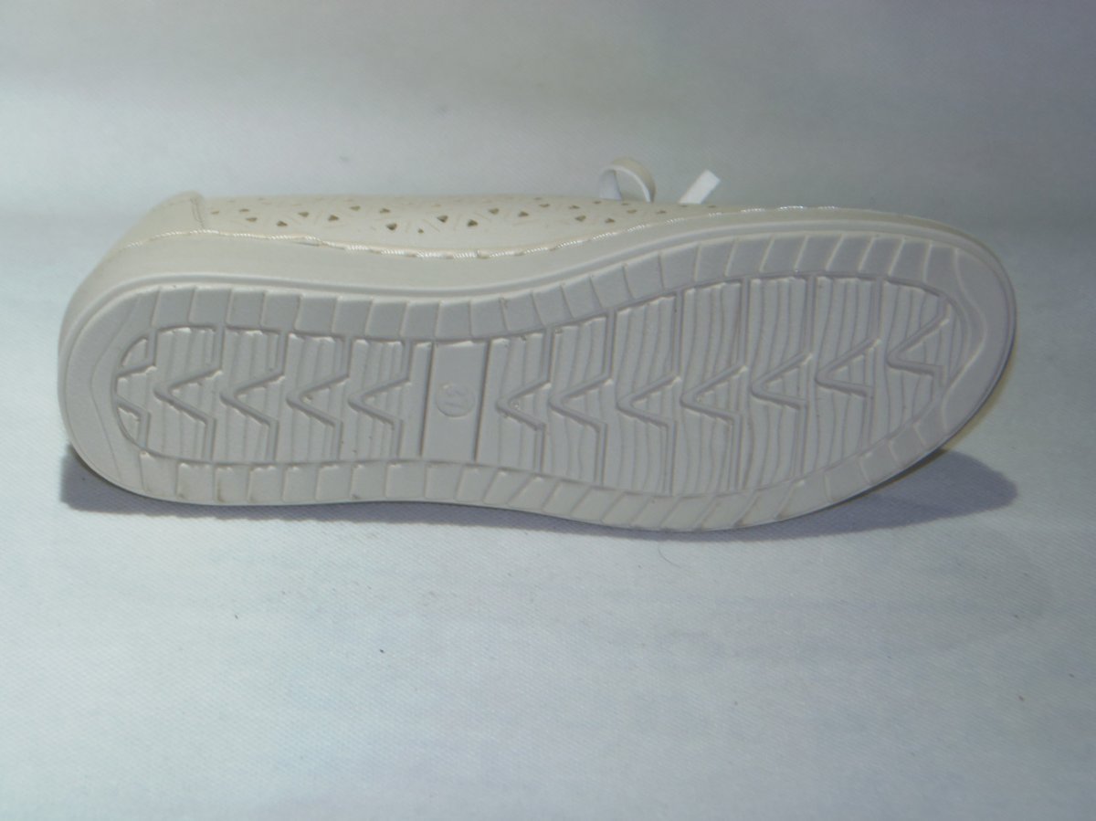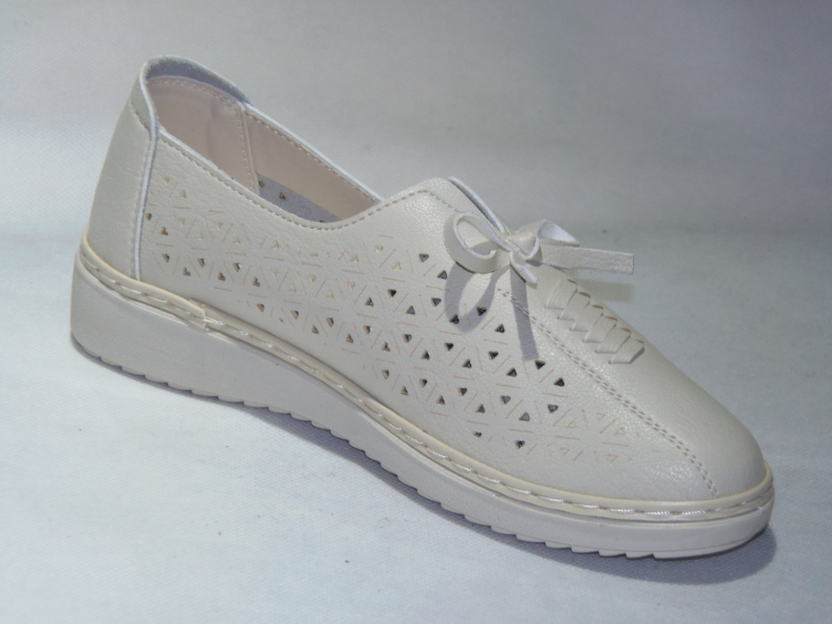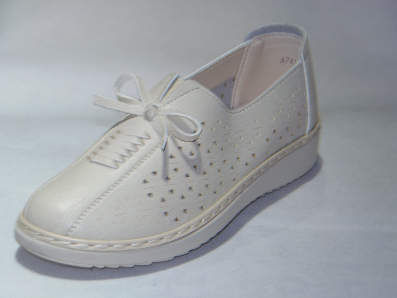 Półbuty damskie wsuwane z gumką i kokardką, podeszwa klin szyta, z dziurkami na wierzchu PU.