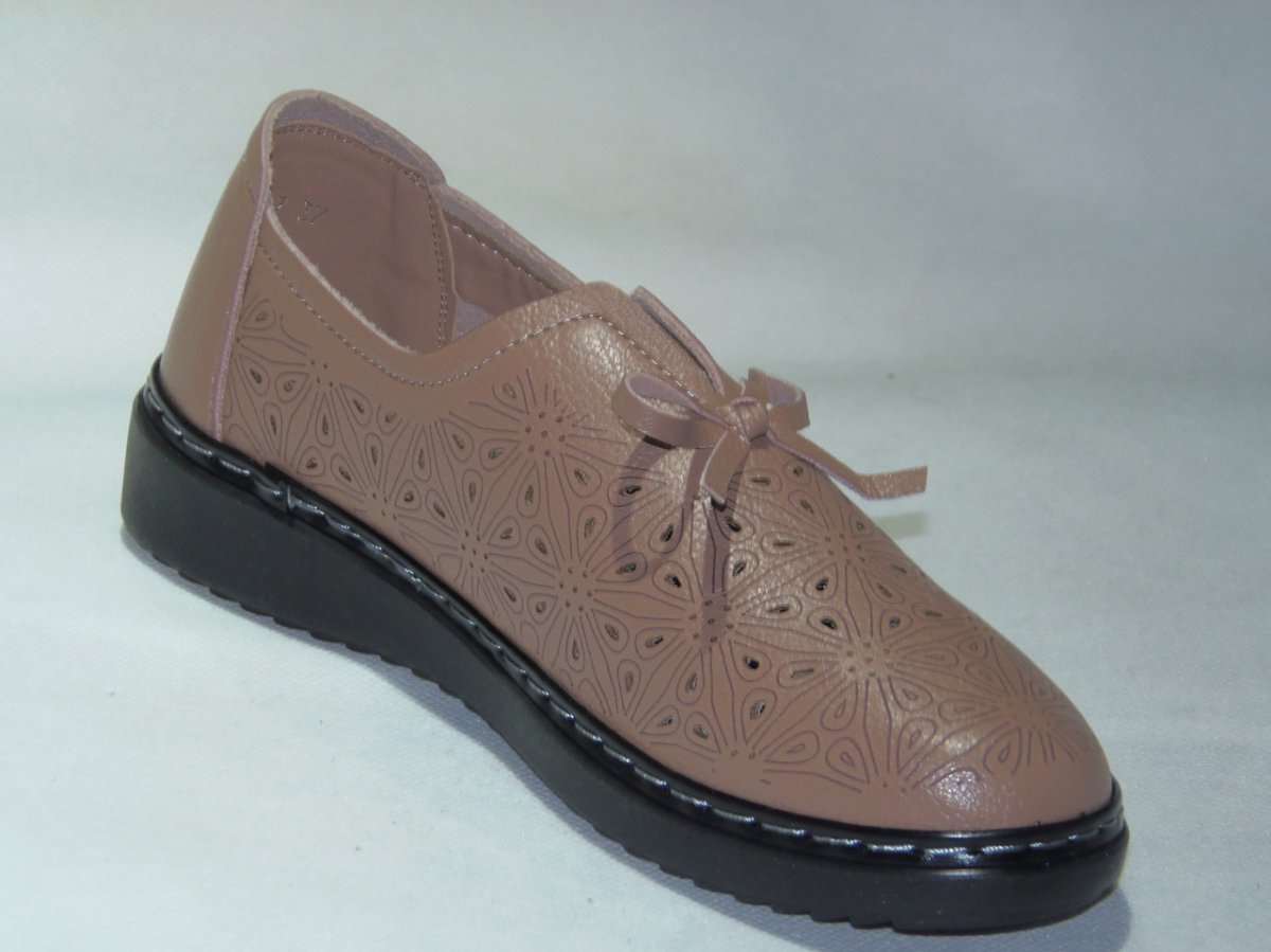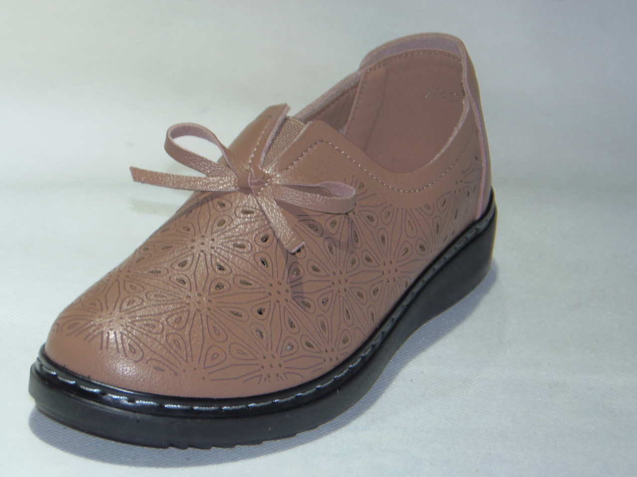 Półbuty damskie wsuwane z gumką i kokardką, podeszwa klin szyta, z dziurkami na wierzchu PU.