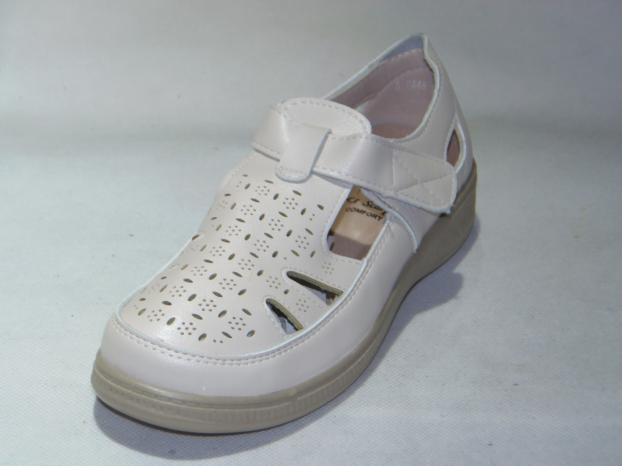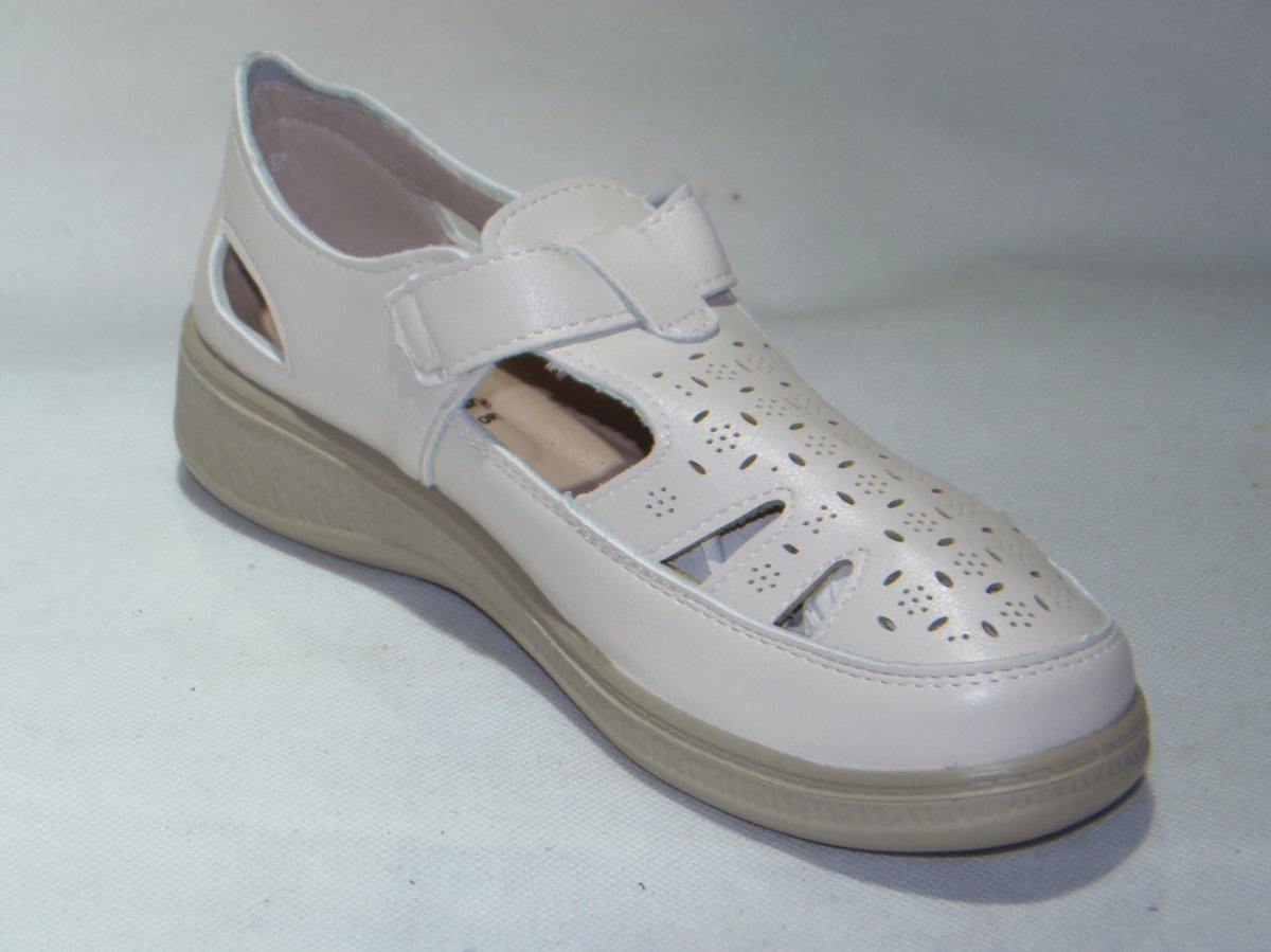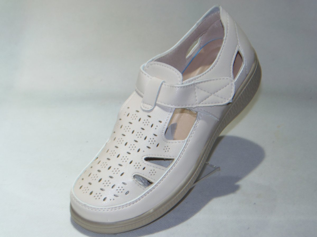 Półbuty damskie wsuwane z rzepem, podeszwa klin, z dużymi dziurkami wierzch PU.