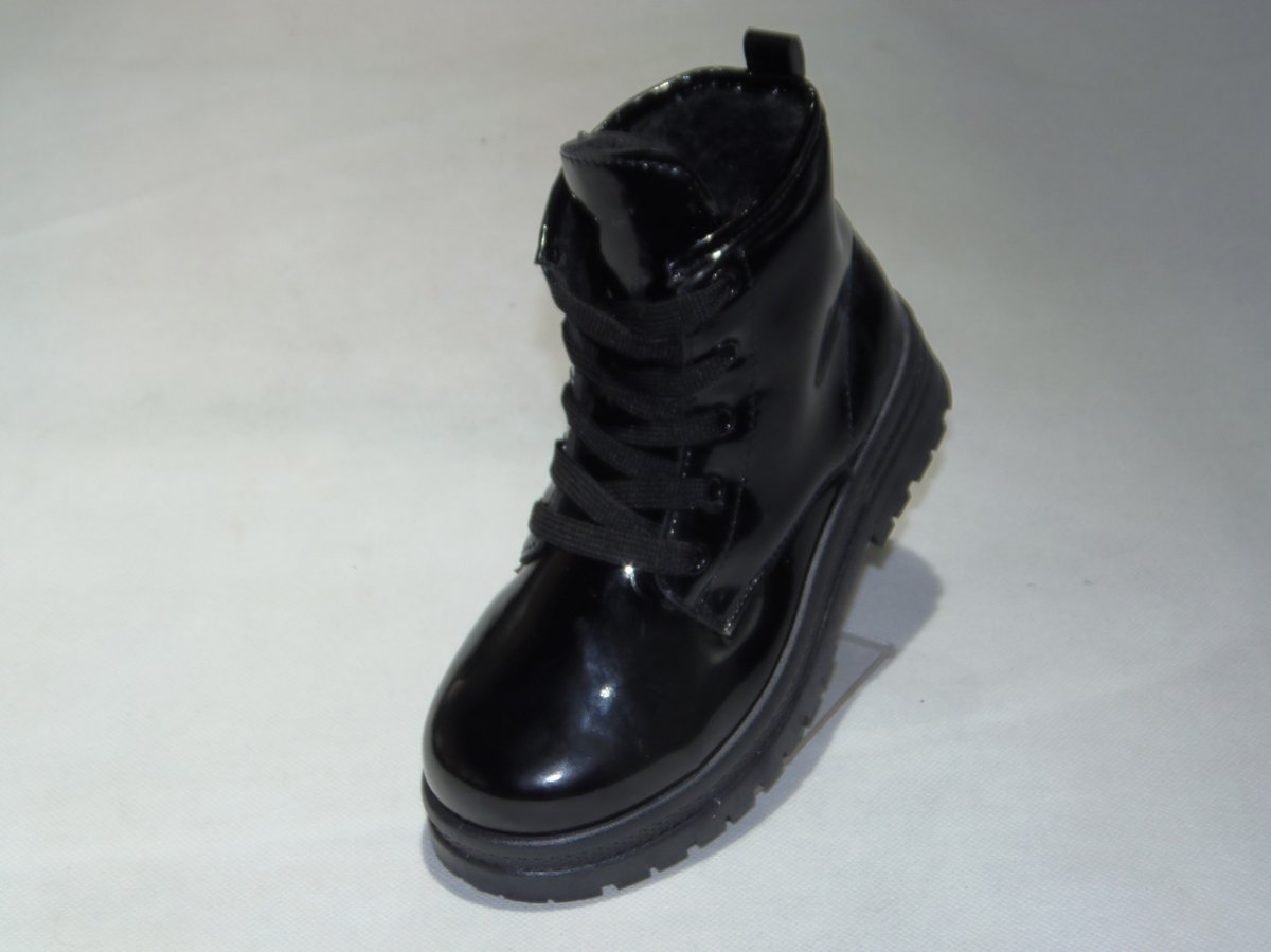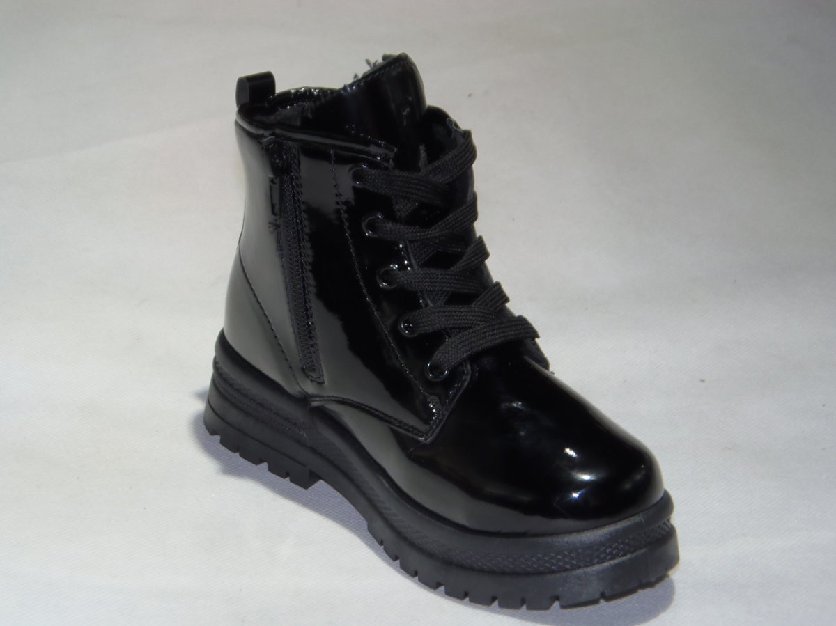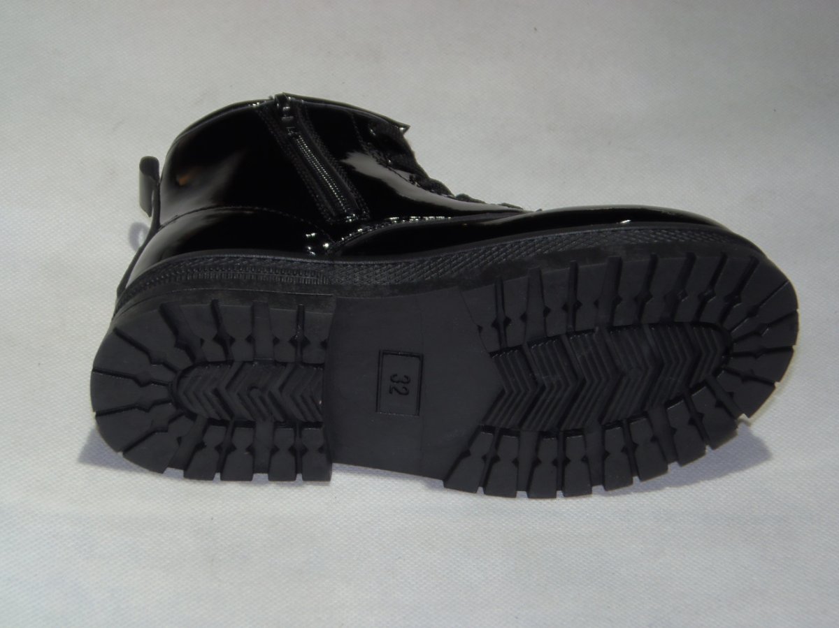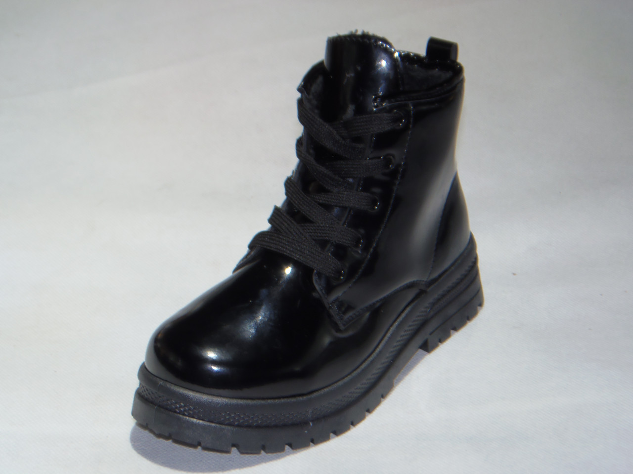 Botek dziecięcy wiązany lakierowane gruba podeszwa obcas, zamek.